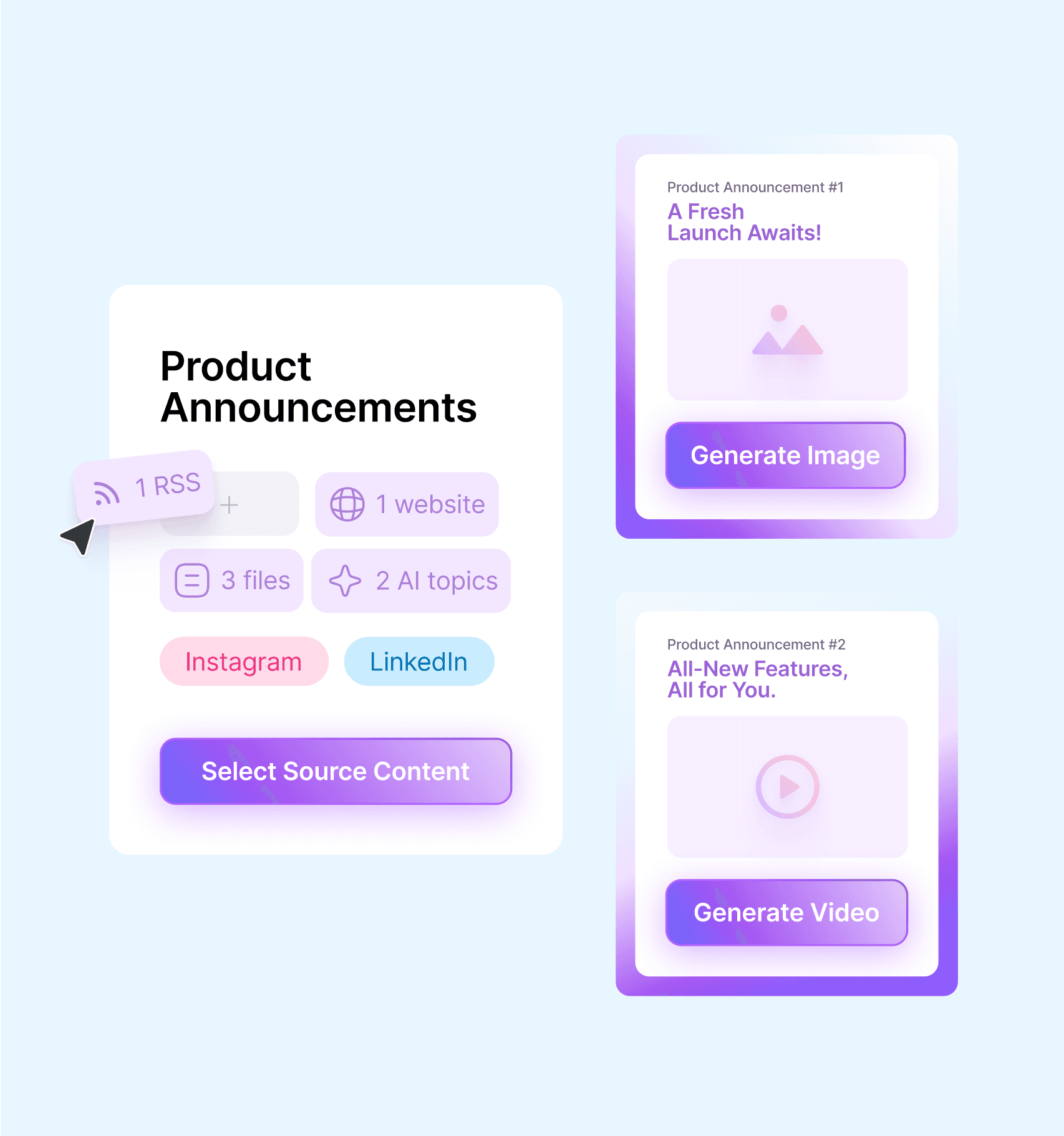 Upload your knowledge vault, scrape websites, generate topics with AI, or pull content through RSS and API feeds.